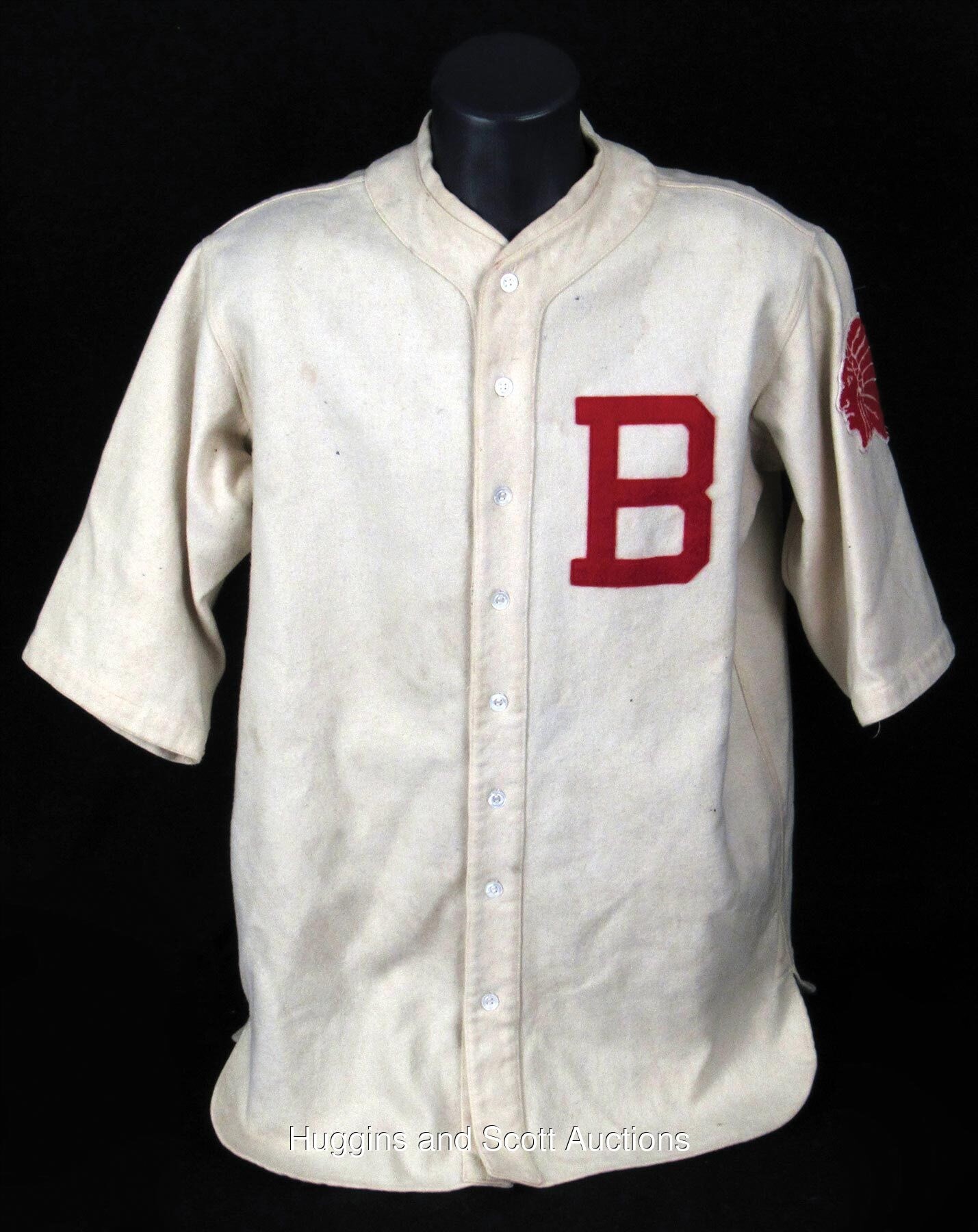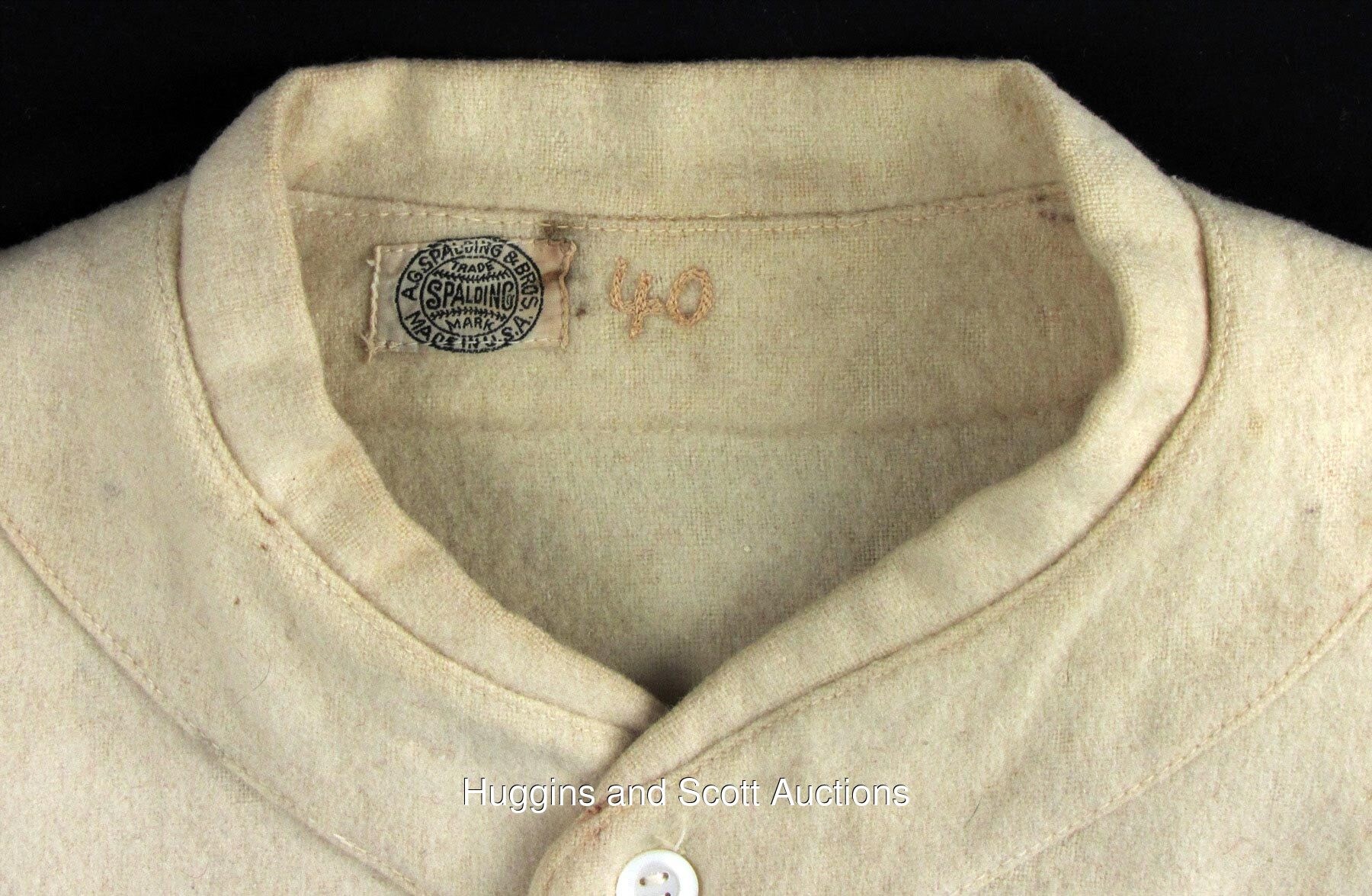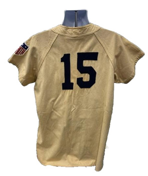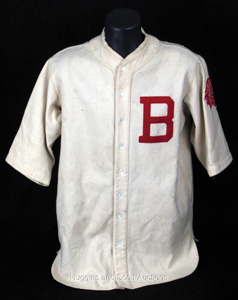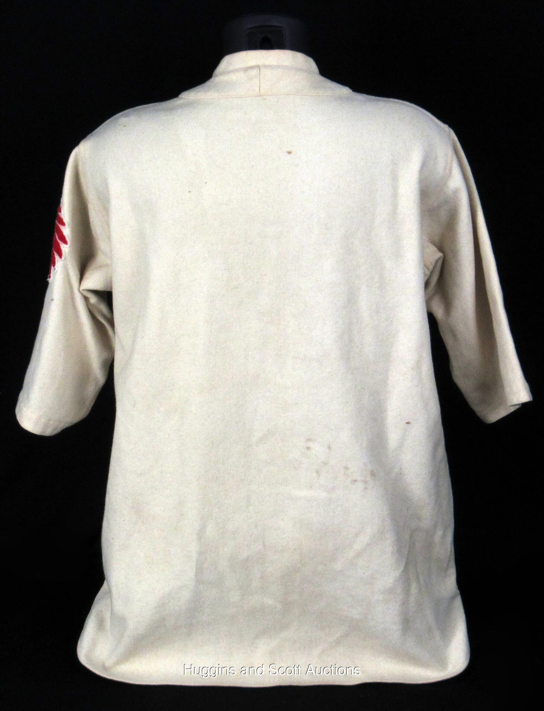 This one has a lot of history behind it. Sold at one point as Babe Ruth's last jersey, it was later attributed to Wally Berger in 1933-34. Since it has piping on the front it must be the 1934 style introduced late in the prior year as was a common practice then.