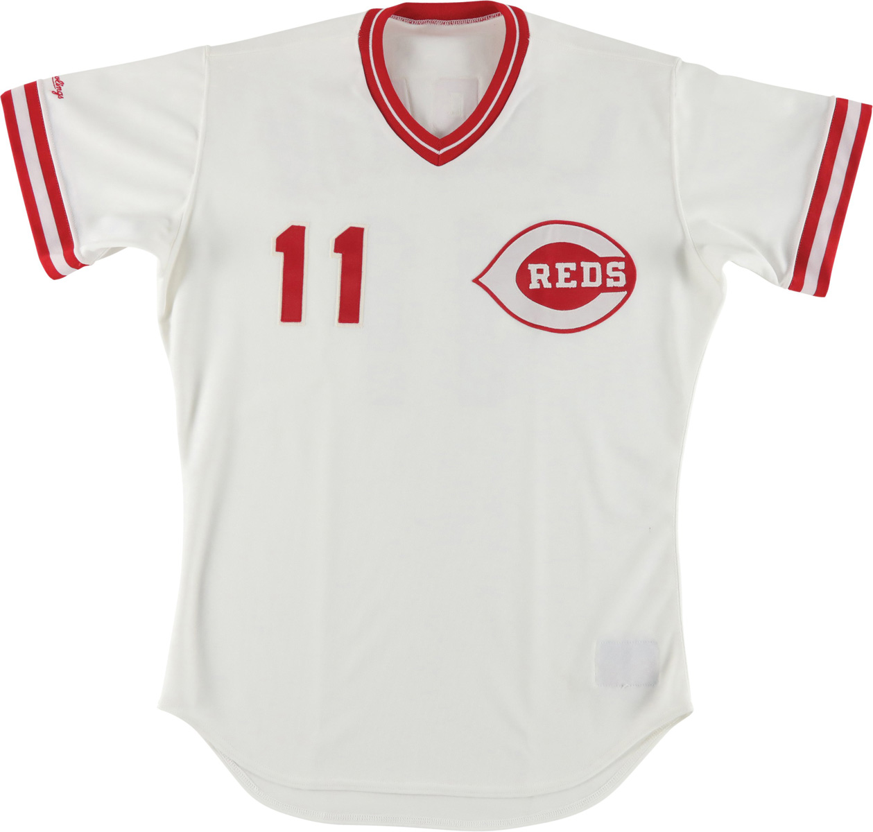 The Reds adopt double knit polyester pullovers. Aside from adding sleeve and collar striping, there is no change.