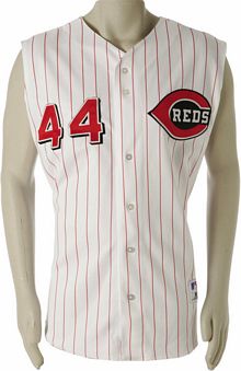 The last holdout to drop pullovers for button-downs, Reds owner Marge Schott wanted jerseys and a cap reminiscent of the team's style of her 1950's youth, so the Reds go to pinstripes featuring a sleeveless vest home jersey, red undershirt, and white pinstriped cap.