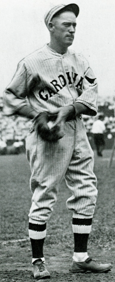 Pinstriped white home, road grey jerseys with "Cardinals" in cursive. Navy caps with "SL" insignia. Some photos, looks like spring training, show caps with no logo and red seam stripes. US flag sleeve patch worn in 1918.