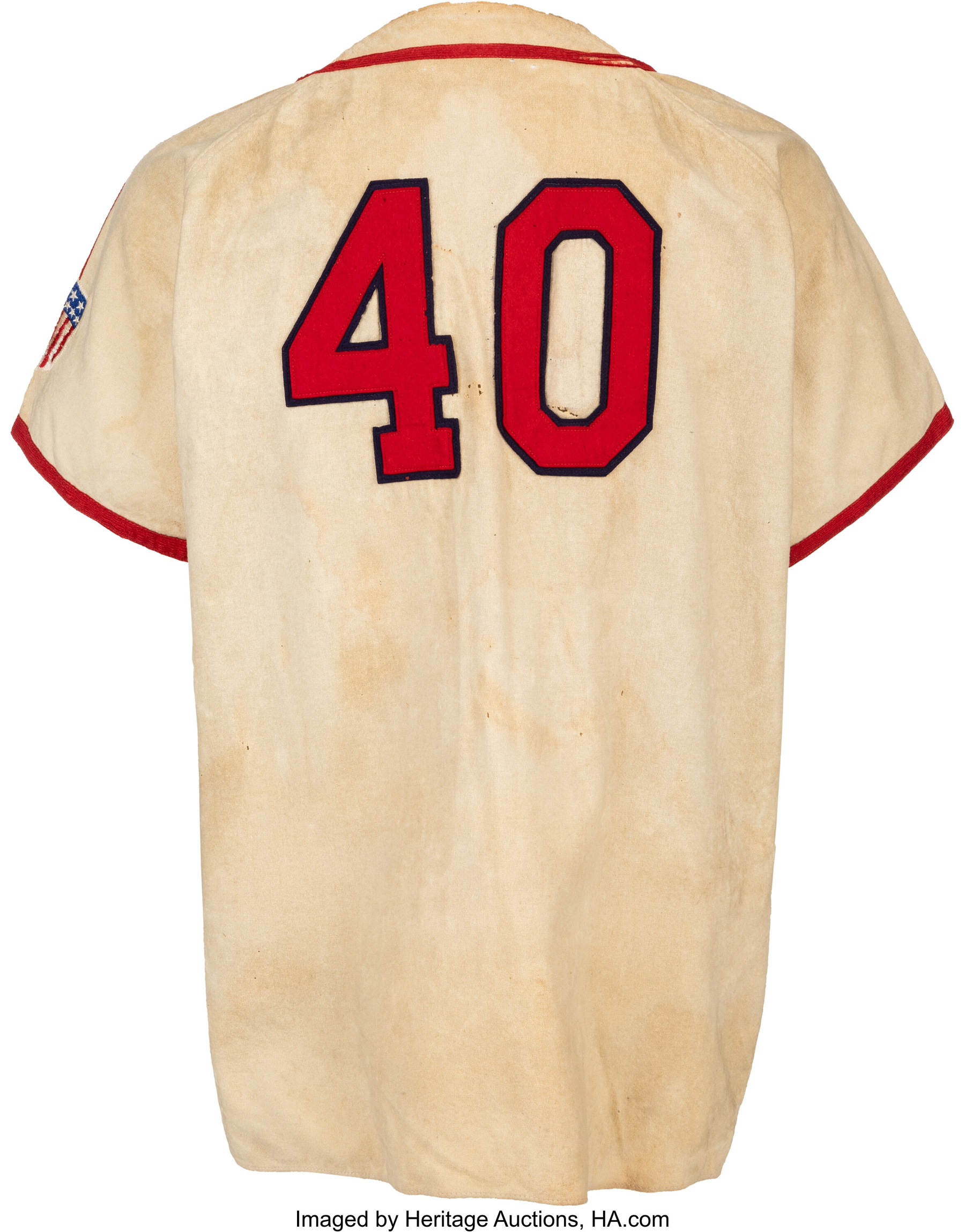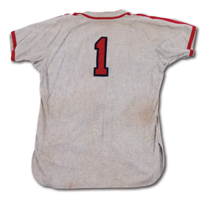 Buttoned jerseys are used in the later part of 1944 and the World Series with the same style carried over to 1945. Stars & Stripes patch worn 1943-45.